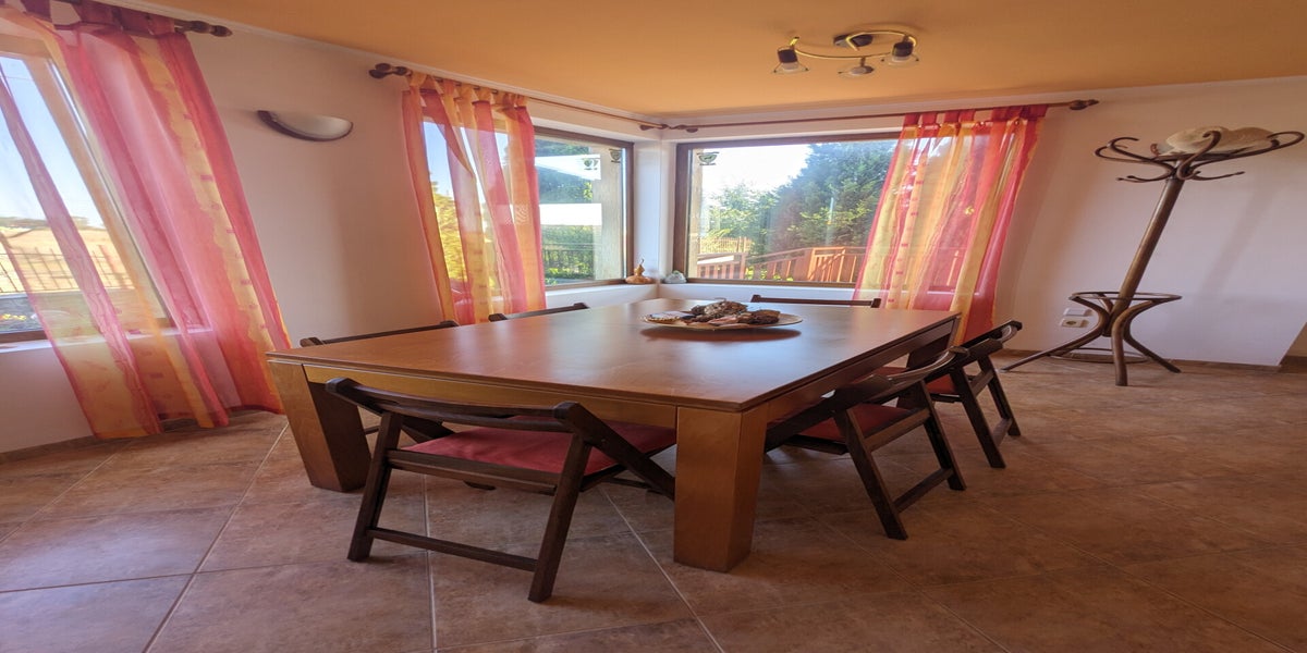 Nestled amidst a large, well-kept lawn, the vacation rental in Tyulenovo boasts a spacious ground-floor patio, perfect for enjoying morning coffee or evening gatherings while soaking in the serene surroundings. The upper floor features a delightful terrace that offers stunning sea views, ideal for sunset watching or stargazing at night. The expansive lawn is not only perfect for outdoor activities but also provides an excellent spot for stargazing, allowing you to marvel at the clear night sky. Additionally, a charcoal grill is available for use, perfect for enjoying the authentic flavors of grilled dishes under the stars.